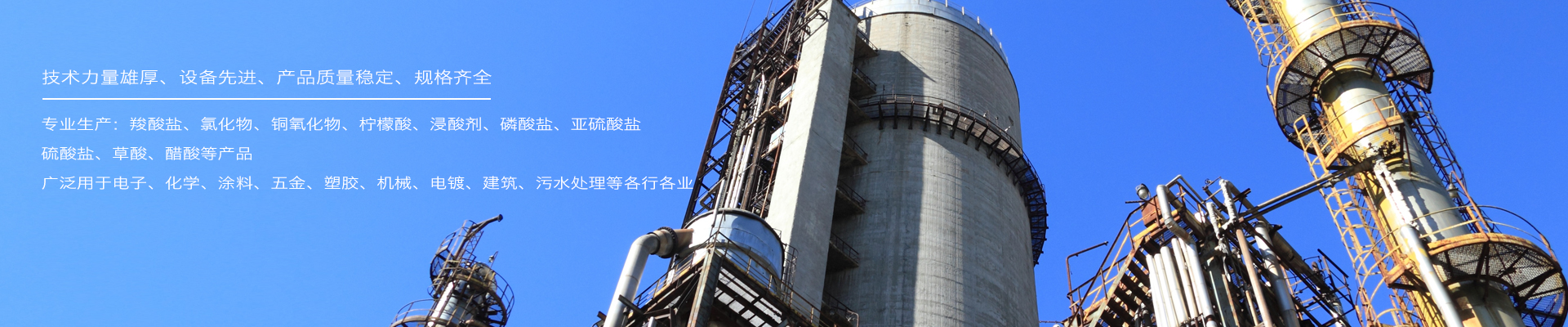 公司位主要產品有:羧酸鹽、氯化物、銅氧化物、檸檬酸、浸酸劑、磷酸鹽、亞硫酸鹽、硫酸鹽、草酸、醋酸等,廣泛用于電子、化學、涂料、五金、塑膠、機械、電鍍、建筑、污水處理等各行各業。
